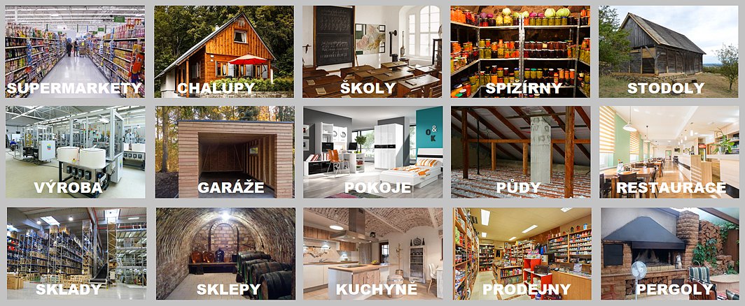Domy, Půdy, Byty, Restaurace, Továrny, Supermarkety, Obchody, Sklady, Garáže, Počítačové učebny, Podkroví, Kanceláře, Školy, Skleníky, Stodoly, Veškeré vnitřní prostory